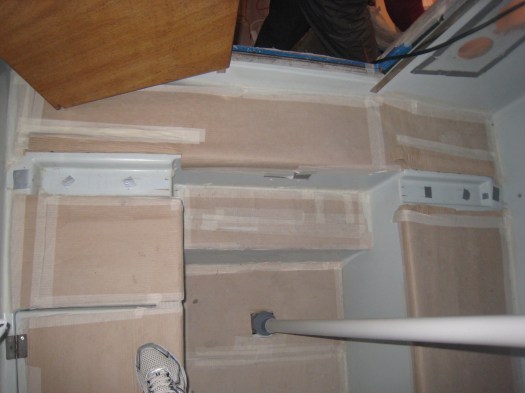 The next step was to cover all the accommodation and parts of the deck with cardboards. That was going to protect the boat during the refit.