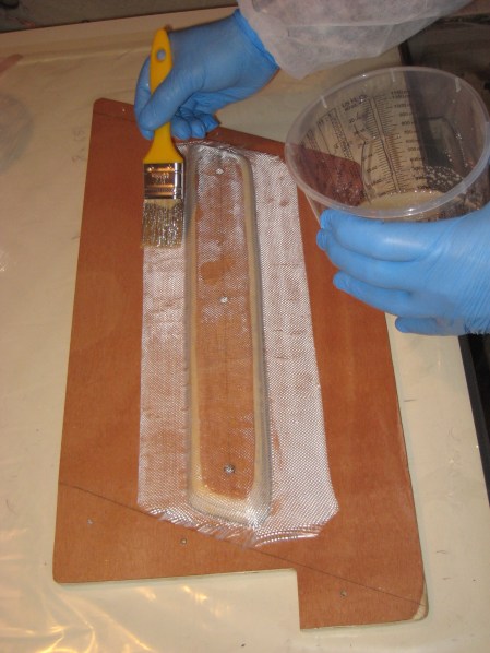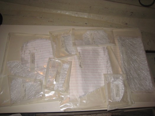 Preparation for the epoxy session took a couple of days. All the areas had to be cleaned and dust free to guarantee a perfect bond for the resins. Every fiberglass cloth was cut to match the according repair. Then the cloths were organised in numbers and packed separately in plastic folders to avoid any contamination.