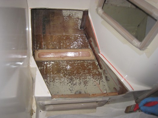 Since there was a wide opening under the toilet double mould, we could check the area and realised there was a bit of flex on the hull. Apparently nothing to be worry about according to the Jeremy Rogers Yard. But anyway we thought it could do no harm to reinforce the area with a little stringer, some glass matt and a bit of epoxy.