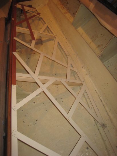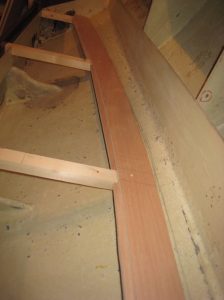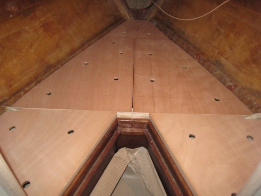 In the forepeak we had to create some kind of support for the V-berth without making it too heavy and ugly. The idea was to use epoxy with fiberglass cloth and bond to the hull a pair of long plywood batten which could support the berth.