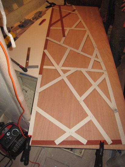 so we started drawing some holes in the pieces of plywood which were already cut to shape for the front cabin and the saloon.