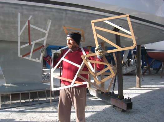 The first thing we had to do this month was to take measurements for the interior woodwork. That included a double V-berth in the forepeak, a starboard berth in the main cabin and a full stern berth, as well as some other small wood lockers and shelves.
