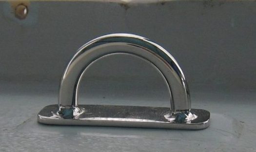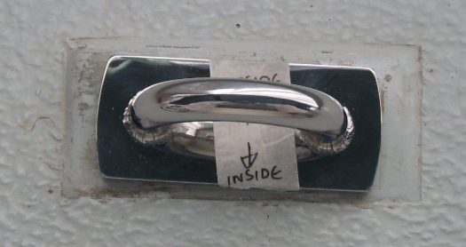 This is one of the backing plate that was sent by Jeremy Rogers yard along with the new u-bolts. We bonded it in place with epoxy resin and silica. And then installed the U-bolt with marine sealant.