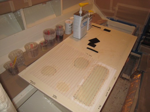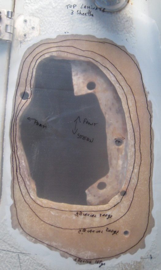 But the major hole we had to laminate was from an extra hatch above the heads. Here again we did a template before cutting out the fiberglass cloths.