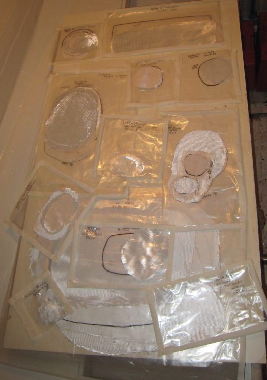 Here are all the different cloths in their plastic bags. This is a protection measure to avoid any contamination from dust or humidity. It is very important when working with epoxy to be clean and organised. We used various types of glass cloths which were specific for epoxy works. These are not the same type as the ones you use with polyester resin, the binding agent is not the same. It is very common for most amateurs to use the wrong type of cloth.