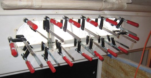 The procedure for fitting the new windows was a long job but we had a great documentation sent by the Jeremy Rogers yard describing all the steps. After cleaning the old sealant around the window frames, we had to fill up the voids with epoxy + filler and also bonded the inner moulding with the deck. We used plenty of clamps and then trimmed the excess filler.