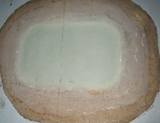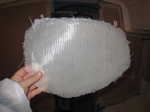 These backing patches are very simply made with two layers of biaxial cloth and resin. When pouring the resin on the cloth you have to make sure there is just enough resin to get the fiber translucid.