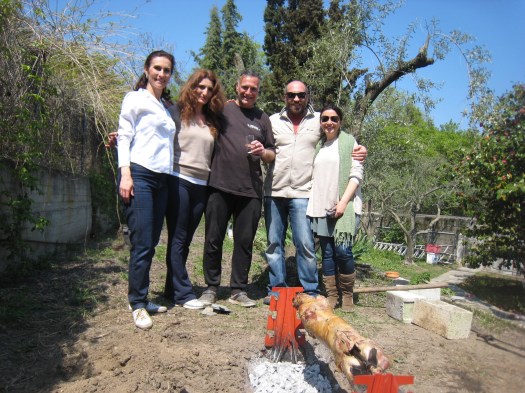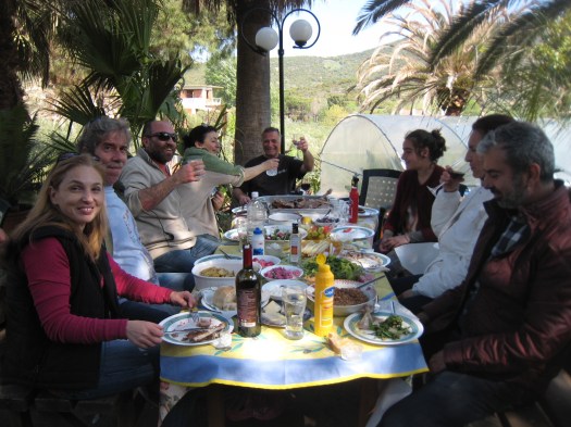 We had to stop our work for Easter Day . This is the most important celebration in Greece. It is the day of the grilled lamb (or goat in our case….) Here we are with the roasting animal ! It is actually something like a big souvlaki ! For vegeterians and vegans it’s a macabre spectacle…