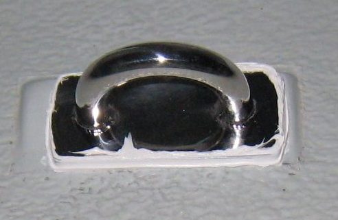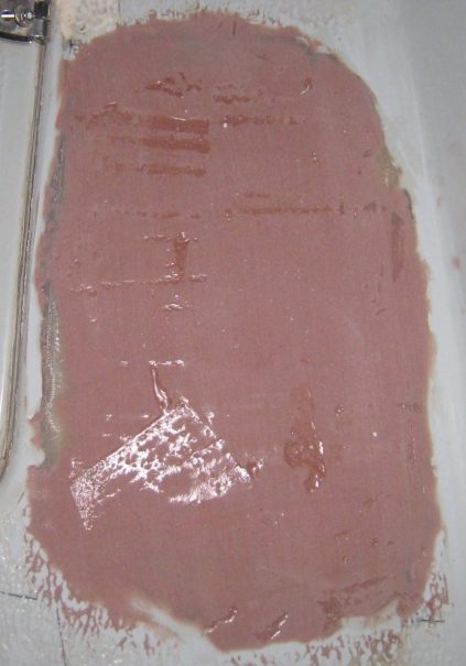 After filling the area around the edges with the same mixture: epoxy resin mixed with colloidal silica and milled glass, we sank into it a plywood piece cut in shape. It was then necessary to place something heavy on top of it, in order to make it stay put.