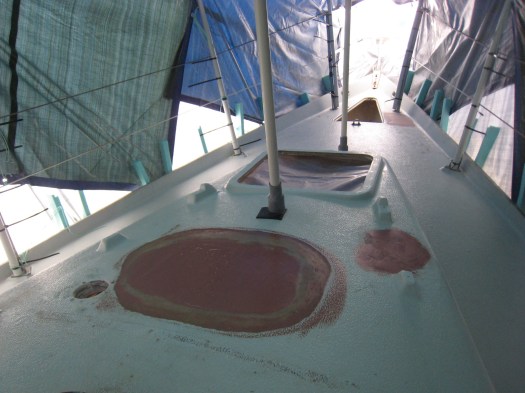 Springtime came with the heat rising each day under our cover. We had to hurry up and finish the epoxy repairs on deck. Epoxy resin is a great material to work with, especially for amateurs. It is a bit like cooking. You take a pot, mix some resin and add different fillers depending on what you want to repair.
