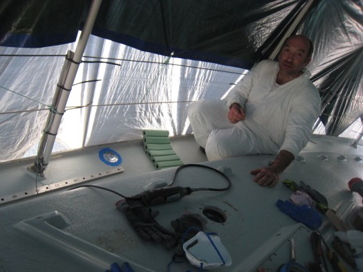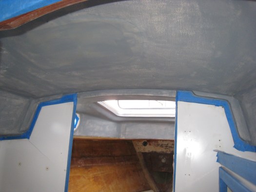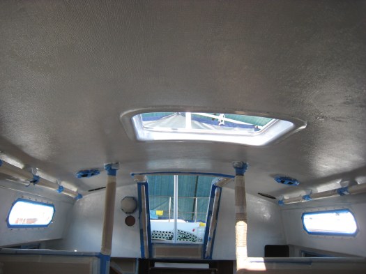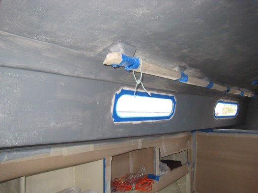After those repairs, we continued with the cosmetic part of the refit and painted the ceiling of the interior. This horrible grey color is just the primer.