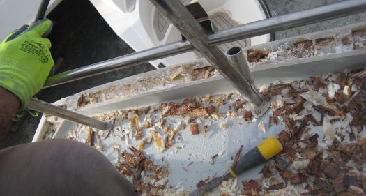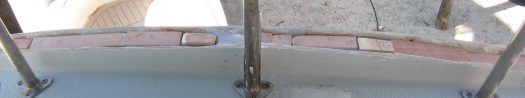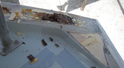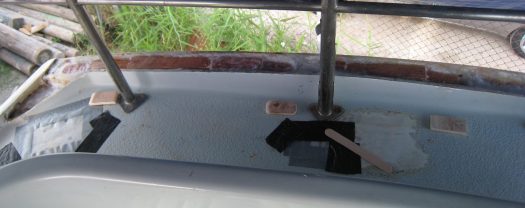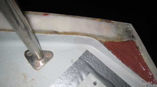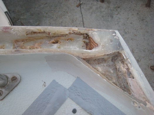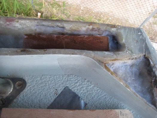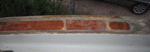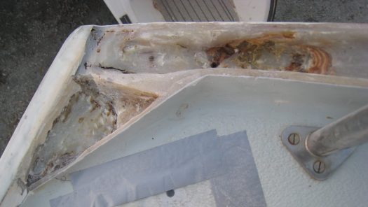 We thought it was better to open the area and find out what was encapsulating the moisture. This is one of the rare parts on deck which is sandwich. Under the stern toerail, there is plywood. This was probably laminated in to the boat in order to reinforce the area. Surfing around the internet we found on the Benelux CO32 owner association website, an owner who had the same issue and did the repair.