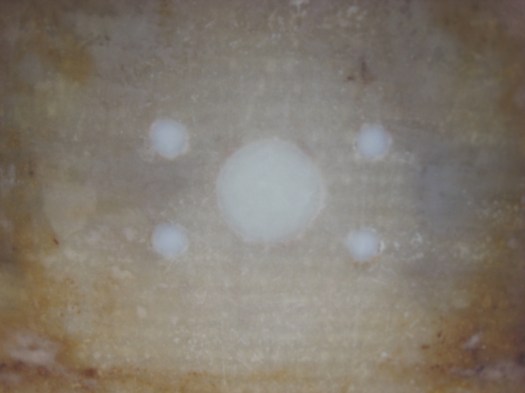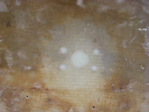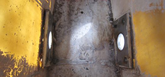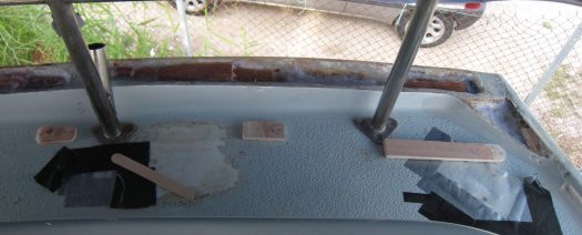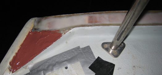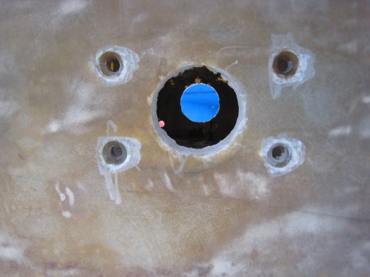 To patch up the area we first created two plugs made of epoxy + silica + glass fiber. We used two little cups as moulds and poured the resin mix in. We then trimmed these plugs to fit in the holes and fixed them in with resin. The screw holes were filled up with the same resin mix. To finish the repair and give some structural strength, we laminated a few layers of glass cloths inside and outside the area.