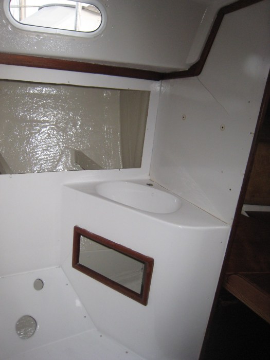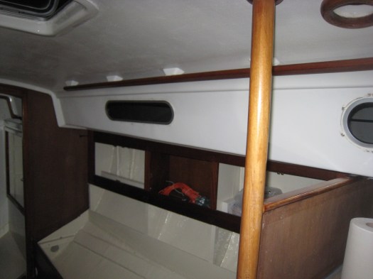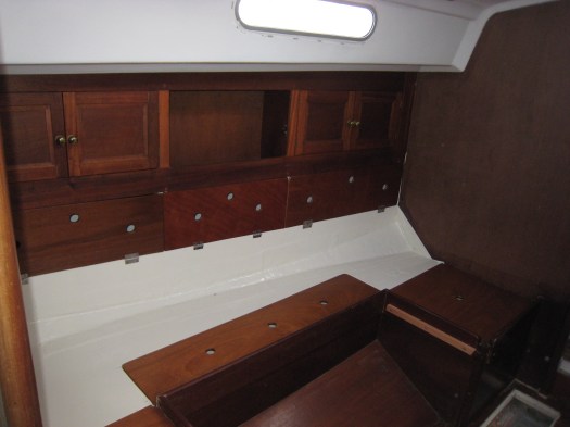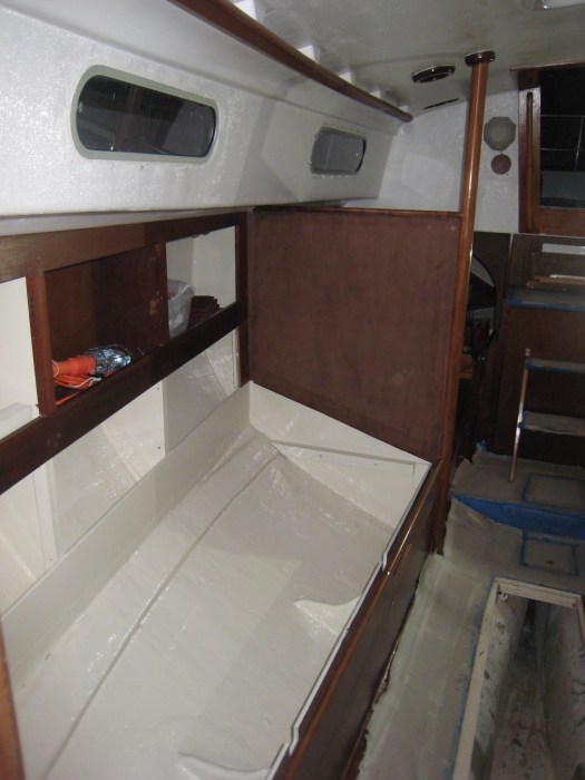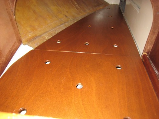 And the big day came when we finally installed all the new boards inside. We were very pleased with the interior look of our Contessa. This is the new front cabin with the different boards giving access to some storage underneath.