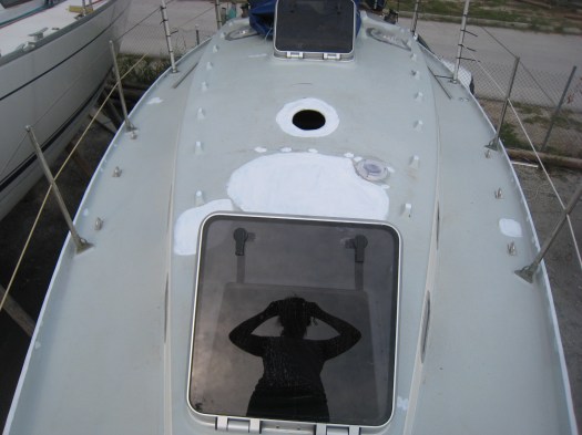 The deck with the new Gebo hatches. The white areas are where we did the repairs. Because epoxy cannot stay long in the sunlight, we painted the repairs with a two parts polyurethane white primer. In the future we are also planning to repaint all deck.