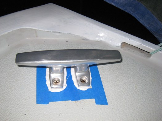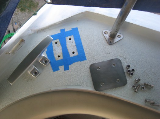 Meanwhile we started installing the stern cleats. Originaly we found that the cleats were just bolted through with no reinforcement. The deck is certainly very strong in this area, but still we thought it was wise to add some extra strength. For each cleat, we ordered two nice stainless steel backing plates which would give the necessary reinforcement.