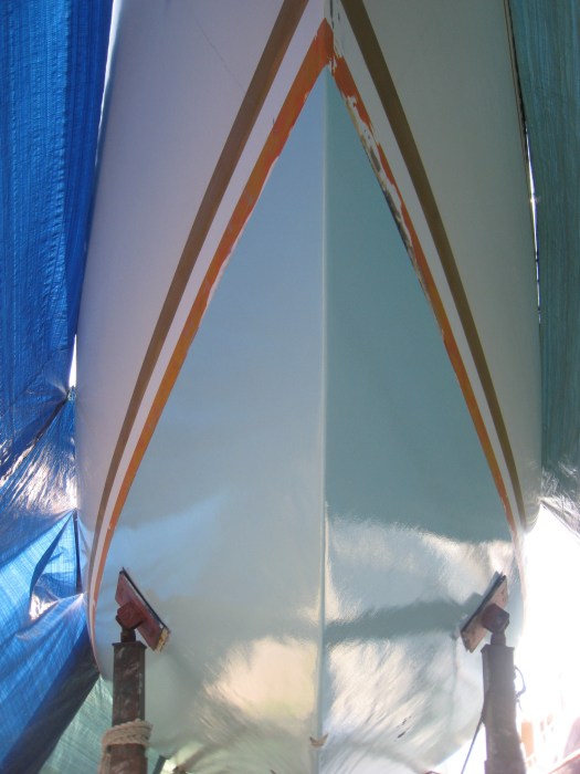 The next day, sanding again by hand and then cleaning again….and paint the second layer of epoxy from International (Gelshield Plus).