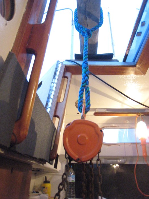 For this job we used a manual chain hoist and a piece of hard wood across the companionway.