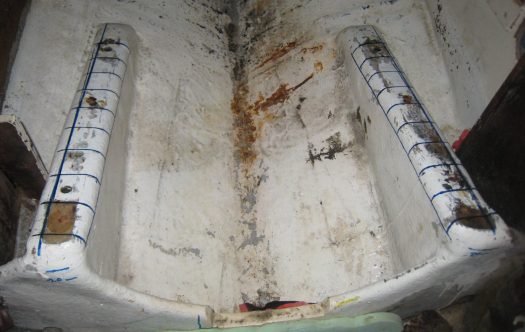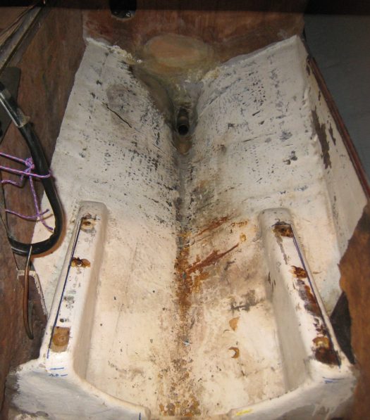 We checked for any dezincification of the bronze tube, but it looked in good condition. What we discovered though, was a hole underneath which was filled up with dirt and some kind of old polyurethane foam mixed with resin. All this mess didn’t look very appealing. After further investigations we are now thinking that this is were the water dripping from the stern gland, found its way inside the skeg.