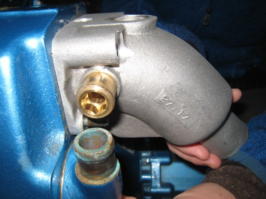 The new exhaust elbow. Another piece of cast aluminium which will corrode if we don’t change the anode frequently.