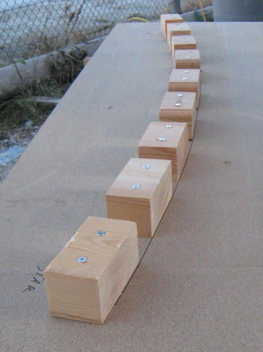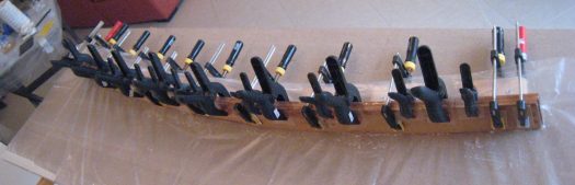 A simple template was created in order to bend the 3 Iroko planks. Â We had previously asked a friend carpenter to pre-cut those three pieces with a band saw. A maximum thickness of 7mm for each plank was needed to get a final piece of 21 mm.