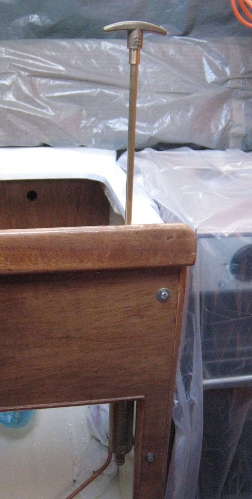 The new brass pump was through bolted next to the sink and under the counter top, allowing the handle to move freely up and down.