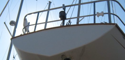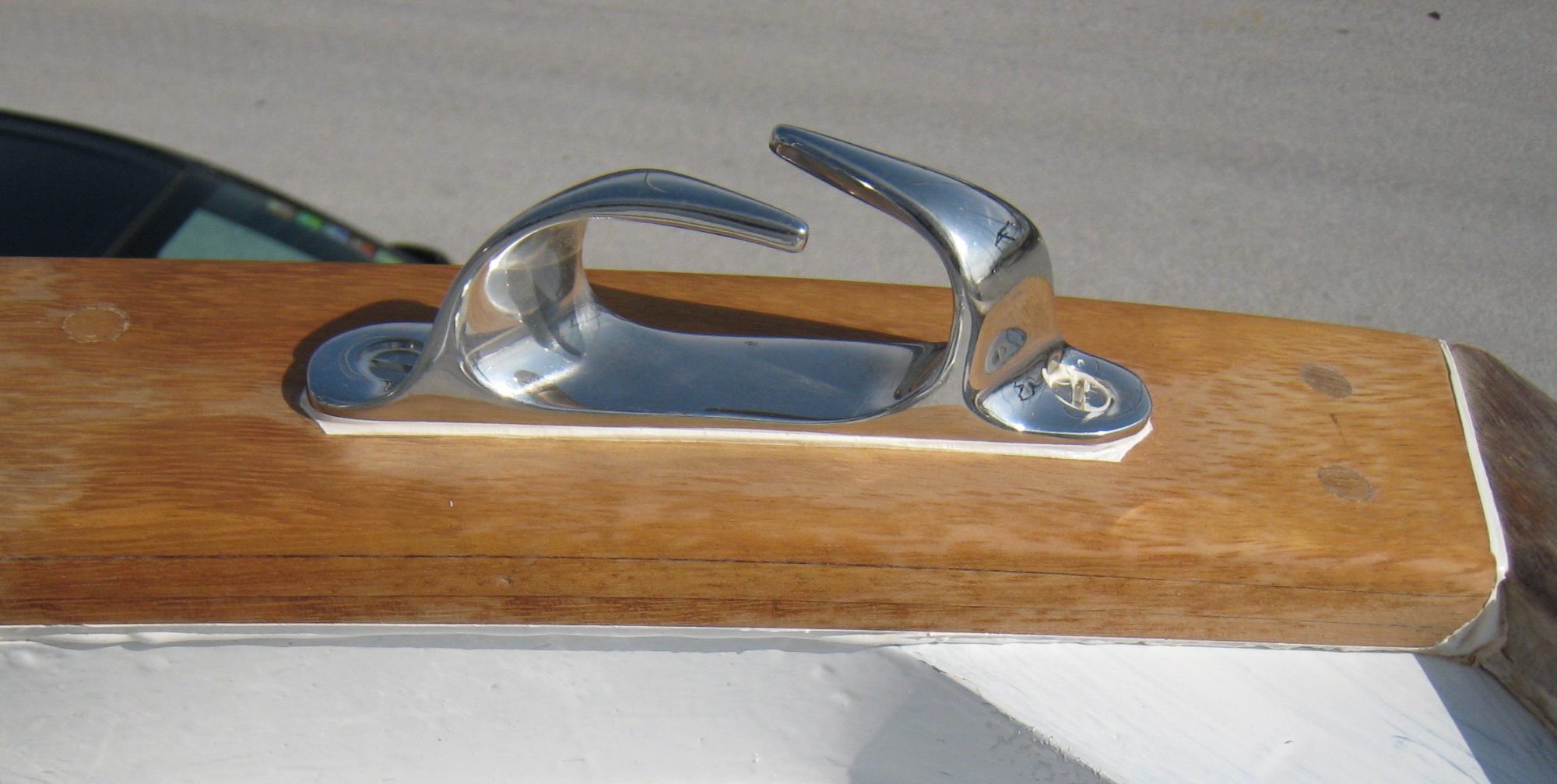 The newly made taffrail was fixed with 5 X 50 mm screws, but the two fairleads were attached with 6 x 60mm. Needless to say, we used proper stainless steel countersunk wood screws and not chipboard ones ! We could have used marine bronze instead of stainless steel, but we found this material too soft and difficult to work with.