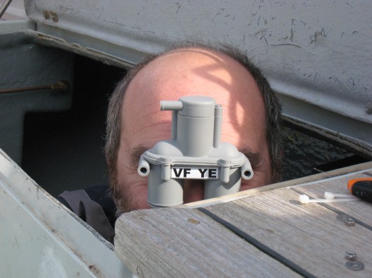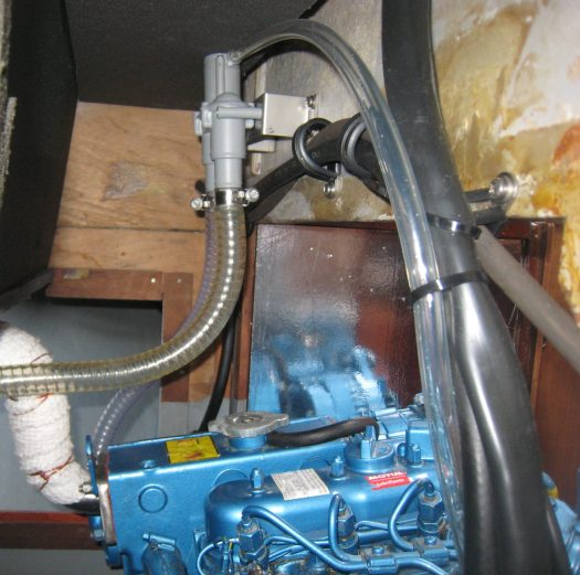 A last but important step in the exhaust line was the installation of an air vent. This little item, includes a valve which prevents sea water from returning back to the engine when it stops. Ideally it must be installed about 40 cm above the water line. It is also important to clean regularly the valve in order to avoid the formation of salt crystals, which could block the device.