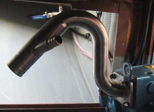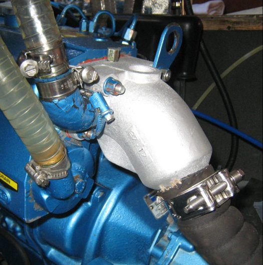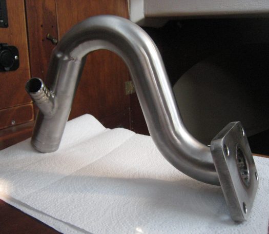 On the Nanni diesel engine, the new exhaust elbow is now made of casted aluminium. If our engine was not so much under the water line and especially not so close to the waterlock, we could have kept this exhaust elbow. But the height in between the exhaust and the waterlock had to be increased. On other Contessa’s some of the owners did the same arrangement in order to avoid any sea water flowing back to the engine.