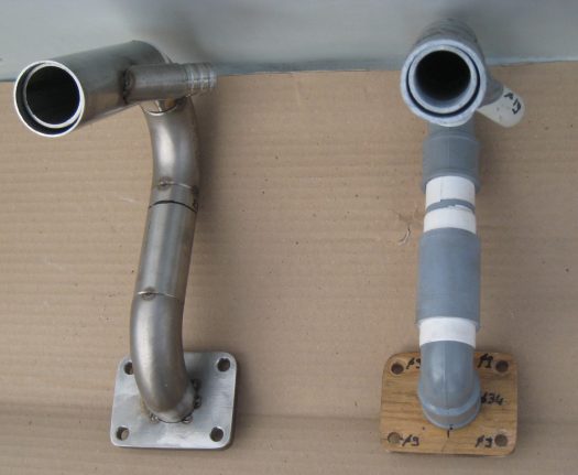 The new exhaust elbow riser was first designed with PVC plumbing pipes. Those were connected together with insulating tape. As a main flange we used a piece of plywood with the exact thickness.