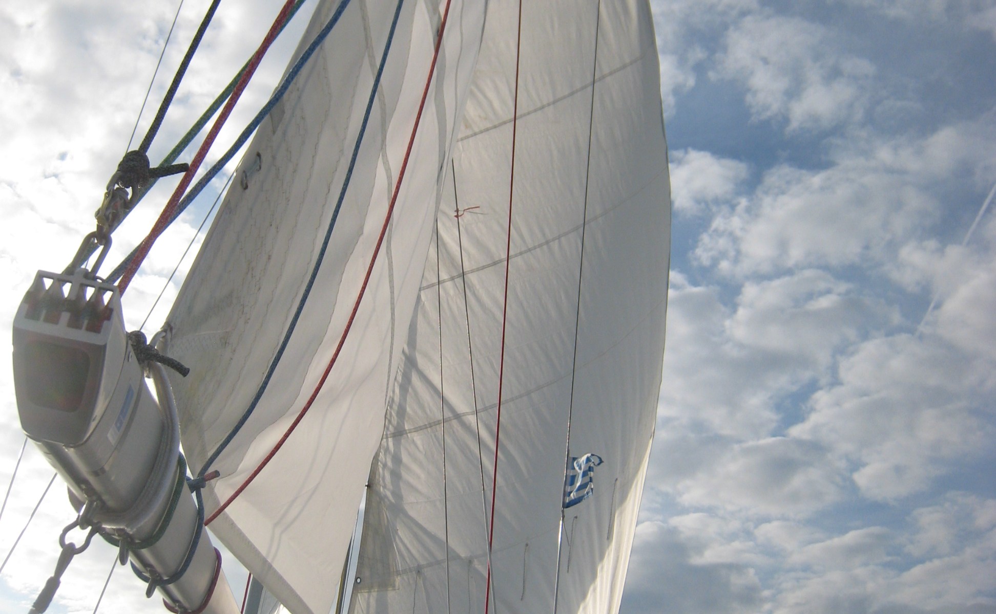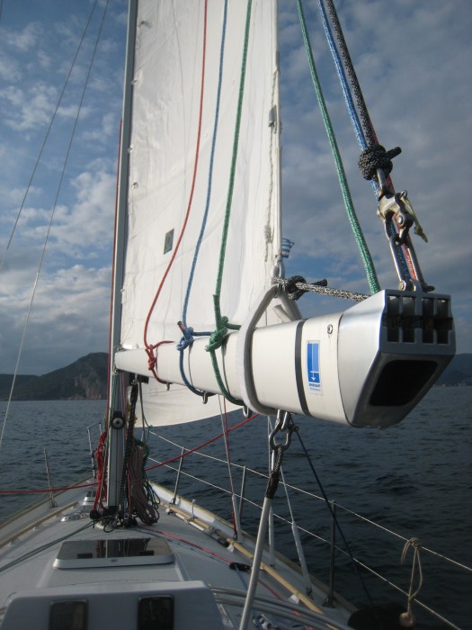 The weather in November and December was marvellous. It was a nice opportunity for trying the boat under sail. We decided to use only the second forestay and hoist an old N°3 gib with hanks.