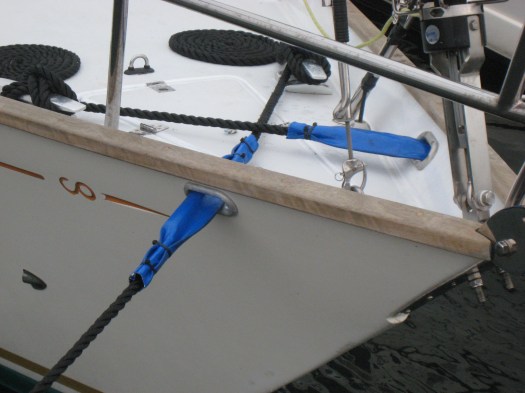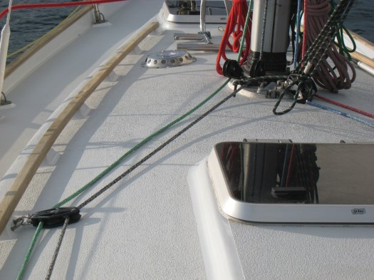 After much thought, we decided that drilling through the deck to install deck organisers wasn’t necessary. In any case, the Contessa 32 was designed with a much simpler system including double blocks on each side of the hand rails. The boat was sailed this way since the 70’s and we felt we should first try everything this way.