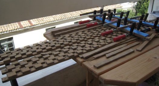 Now that the wood was refurbished, the gluing process could start. The long pieces were re-assembled using epoxy glue and a few stainless steel tapping screws.