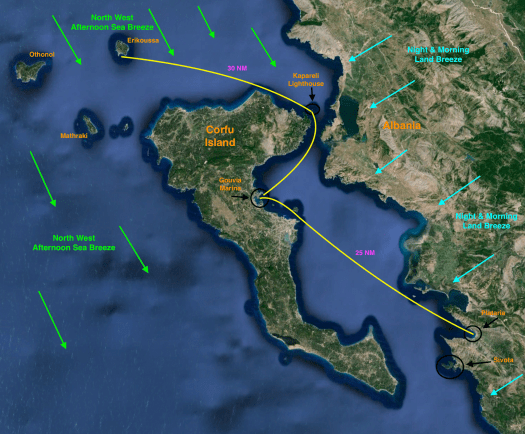 We casted off at 4 o’clock in the morning. An impressive full moon was setting on our stern and made everything as bright as day. As we were going out of Gouvia bay we experienced a magnificent clear sky, full of stars that shined like diamonds. Orion was on starboard, Sirius and Jupiter above us and far away over the mountains, Venus was just ascending. Noticing a light breeze coming from the mainland, we hoisted the main and unrolled the Genoa. Dawn found us as we were passing the reef “Serpa” on our port side. We passed Kassiopi just as the sun was rising. But behind us, a “left over” wave disturbance was rolling the boat making the passage slightly uncomfortable. It was due to a mountain breeze which was blowing the previous night. The motion of the boat wasn’t very pleasant, nothing too serious though.