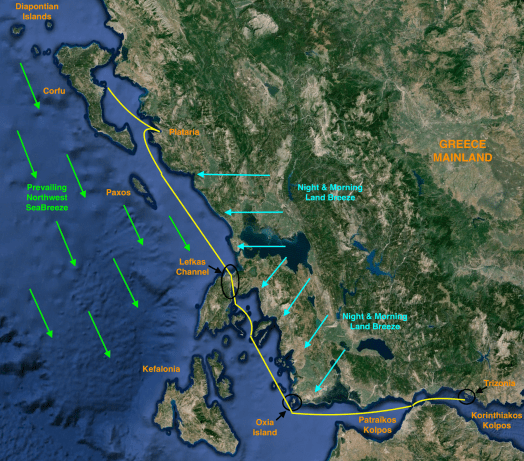 In fact, the current gave us a very good push that helped us gain almost an hour on our ETA (Estimate time of arrival), resulting our arrival at the island of Trizonia when the sun was setting.