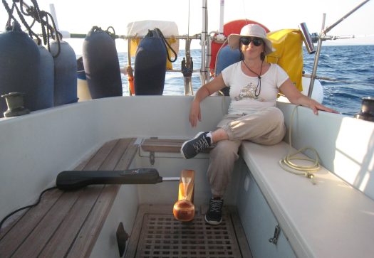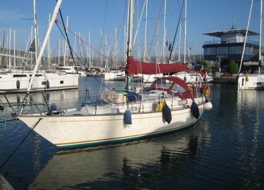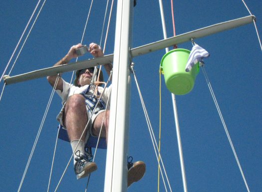 In the days that followed, we began actively to prepare the boat for sailing. As usual, an exhaustive list of jobs had to be done: washing the deck, applying teak wonder on the toe rail, replacing the kedge anchor with a new Fortress anchor, reducing the stern scope of chain, hoist the sails, prepare the reefing lines…etc. And last but not least: install a radar reflector on the mast, above the spreaders. That was a bit demanding for both of us. But with perfect coordination and team work, everything went well. After nearly two hours hanging in the air, we had our new radar reflector attached to the mast.