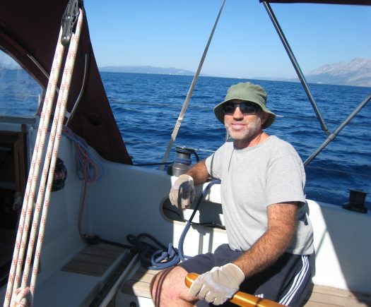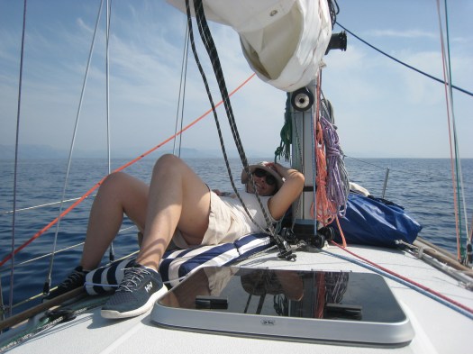 Our first trip with ‘Samourai’ took us southwards to the port of Plataria. On the way, there was no wind at all with very calm weather conditions. To our surprise, that day, there weren’t many charter boats sailing around. They say that having a sailing boat is 80% hard work and 20% pleasure. Well ! That day we had a pay off of this famous 20%. “Captain Jim, ” our auto pilot, was steering the boat and we could sit on deck and appreciate a zen situation !