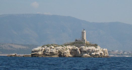 It was past midday and we continued our course to the north. We were heading between Corfu and Albania, towards a little Island called « Kapareli » which is located in the middle of the strait. On the top of it, a lighthouse overlooks a rocky promontory. Entering those waters, a little breeze from the north began to blow. We turned off the engine and enjoyed some nice close hauled sailing. As a foresail, we had the light genoa hoisted and the boat was going pretty well until we approached Kapareli. At first, the plan was to tack around the rocky lighthouse. But as we progressed, the wind picked up and eventually reached over 20 knots. We could not remain so close to the wind with this light sail on, so we finally bore away and changed course to the south. As it is often happening in Greece, the wind dropped a few miles later to a complete no wind, only to blow again outside the marina entrance.