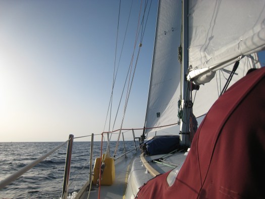 After the sun came up, a nice easterly breeze gave us 15 to 18 knots of apparent wind. We cut the engine off and had a proper sail for a while. With a reef in the main and the yankee all out, Samourai was beating at a nice speed of 5.5 to 6 knots. This is to say that it is not always necessary to have all the sails out in order to reach a good speed.
