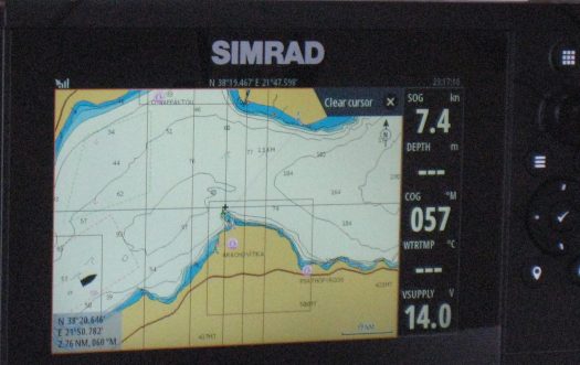 Once under the bridge, there is always a lot of current. In practice, for a small vessel it is almost impossible to cross with adverse conditions. But that day Patraikos ‘kicked’ us smoothly inside Korintiakos Kolpos with an impressing 7.4 Knots over the ground !