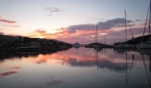 Few days later, again around 4 o’clock in the morning, we left for Lefkas. Coming out of Plataria we preventively put a reef in the main. As it was pitch dark, it took us a bit more time to accomplish the maneuver. But, with the help of the autopilot, everything went well. We do often sail with a reef in the main, even on calm days. It may be an excess of prudence, but we’ve learned by experience that in Greece you can frequently be surprised by strong katabatic winds out of nowhere.