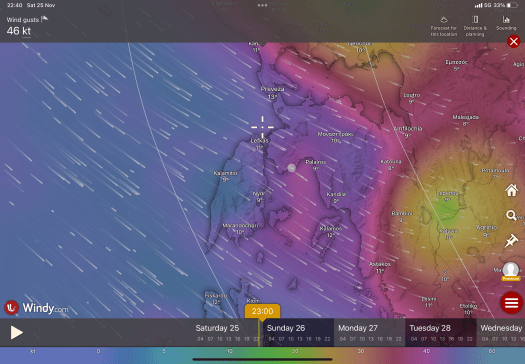 During our stay at Lefkas Marina, we experienced a serious storm. The forecast was predicting a lot of rain but also very strong winds coming from the northwest. This wind direction was very unusual for that time of the year and the strength of the wind was also quite worrying. In summer, a northwesterly breeze is typical of the Ionian Sea. But, at this time of the year, a depression bringing such a strong blow was exceptional. First, we had to endure the warm front which brought southwesterlies with lots of clouds and rain. And after that, the wind veered to the northwest and reached up to force 9. Strangely, even when the barometer started to climb up, the rain didn’t stop ! Ā The local weather station, which was just above the marina office, recorded gusts up to 50 knots !