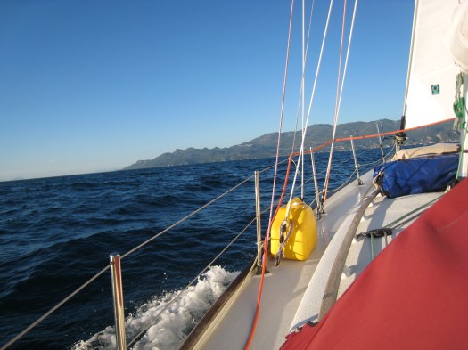 One early morning, in the beginning of December, we woke up with a really good weather. That day, the forecast was predicting strong northerlies in the Ionian Sea and, for the next days, another depression.Ā At last, the wind was fine and the sky all clear. Again, the decision to leave was taken at the last minute. After quickly preparing everything on deck, we casted off at 10:53, seven minutes before the opening of the Lefkas bridge. We didn’t even knew for sure if we were going to make it ! We called the bridge on the VHF and surprisingly, the man in charge waited for us a few more minutes and opened at 11:05 ! Thankfully, there were no other boats waiting to pass, so we went out with no problem at all. But as we were leaving behind us the breakwater, we had a first glimpse of how our journey was going to be. Due to the northerlies, a big swell was coming from the open sea. However, the barometer was high and the visibility excellent. A few hours later, at a distance, we could already glimpse Corfu on the horizon.