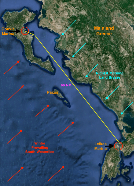 Few hours later, while approaching Meganisi from the south, a strong afternoon breeze started blowing from the northwest. It was the usual “MaĆÆstros” which quickly reached force 5 and was gusting against us.