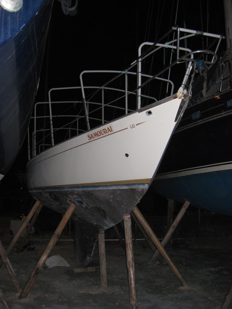 Le camion grue arriva tard en fin d’après-midi et le vent soufflait fort en rafales. Heureusement, une équipe d’ouvriers Bulgares qui étaient en train de démâter un autre bateau,  nous donna un sacré coup de main et tout ce passa dans les meilleurs conditions !