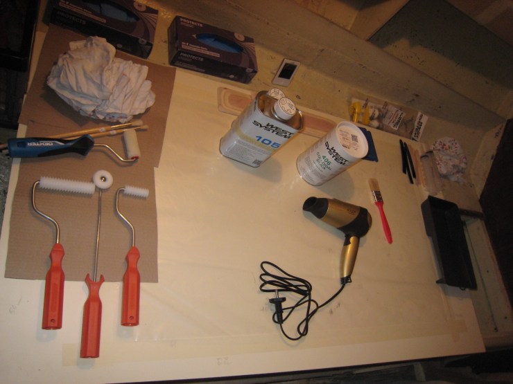 Pour les résines on utilisa les epoxy de la marque West System avec différent type de charges. En règle générale, la silice en poudre fut la charge la plus utile ainsi que les micro-ballons en fonction des réparations à réaliser.