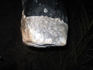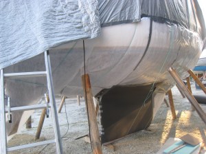 En tapotant sur la quille avec un maillet en caoutchouc on découvrit que de l’eau s’était infiltrée entre le lest et la stratification. Un problème courant sur les constructions à quille encapsulé.