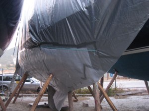 Après avoir démâté, il fut enfin possible de couvrir le voilier pour l’hiver. En prévision des basses températures nous devions trouver un moyen d’avoir du chauffage à bord et surtout de limiter les éventuelles déperditions de chaleur. C’est pourquoi on confectionna un abri au dessus du pont qui permettait non seulement de se tenir bien au chaud mais surtout de pouvoir continuer à travailler sur le pont malgré les intempéries.